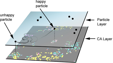 The swarm of particles (bag of marbles) has the ability to alter the rules of the cells (tiles) that they are rolling over. In addition to that, each particle has the ability to record the rule of the cell it is rolling over. Particles record rules when they are happy (when they are having a nice ride), and they distribute those rules onto other cells around as they roll over them. This means that the particle swarm has the ability to change the rules over time such that they end up moving in straight lines more over time. Without ever explicitly designing the CA rules up front to generate gliders, the particle swarm encourages gliders to emerge spontaneously, by way of their ability to alter the rules over time. |