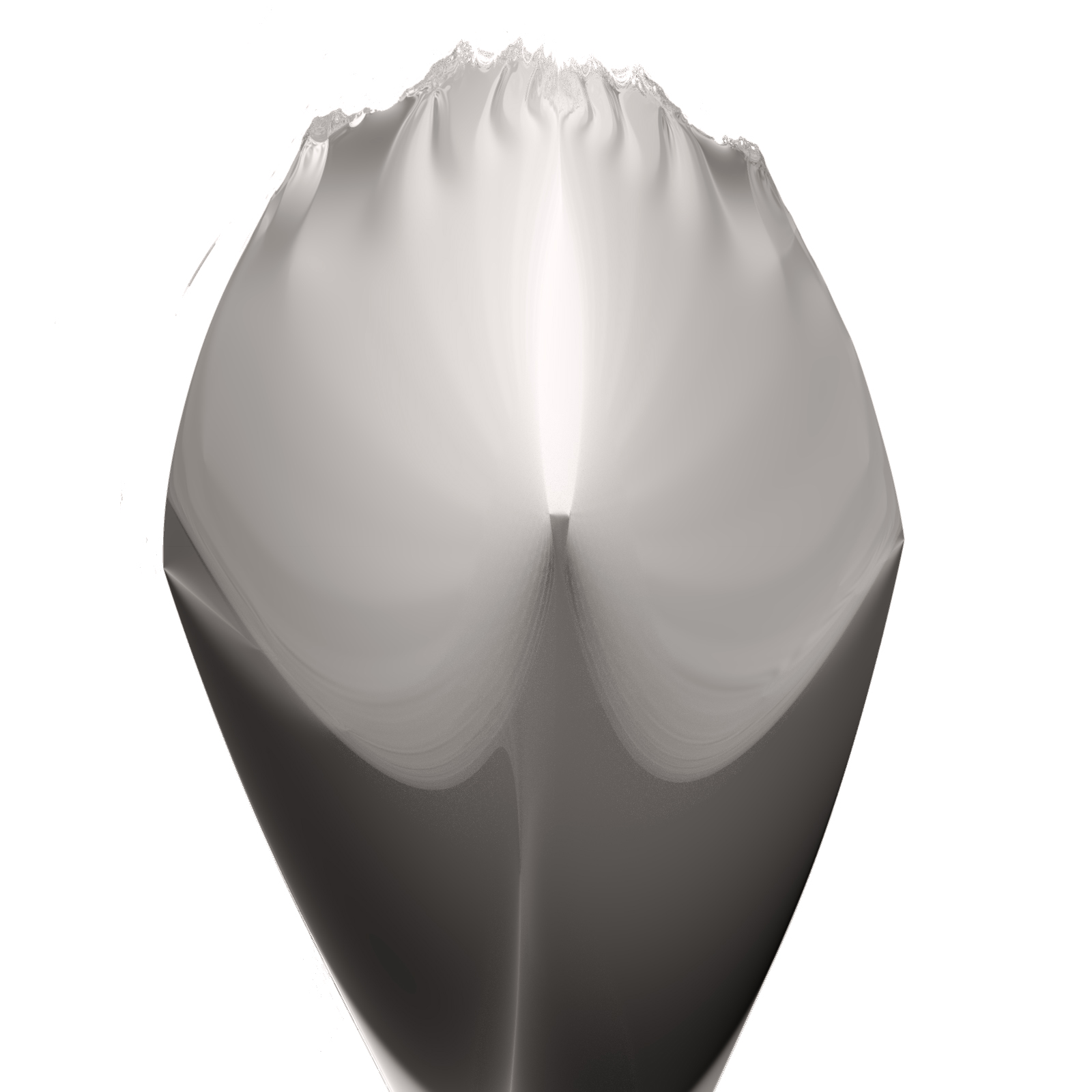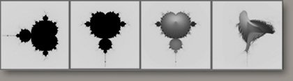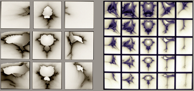 The relationships between these genetic variations is intriguing, similar to the way Richard Dawkins originally described the biomorphs in his Blind Watchmaker program. Dawkins' notion of a "Genetic Space" inspired me to create an art piece that was displayed at Galery Naga in Boston. To distinguish my Mandelbrot Art from what so many others were doing (Psychedelic Baroque) I decided to forget about color entirely, and render my images in GRAY-SCALE. Its all about form - morphology. |
