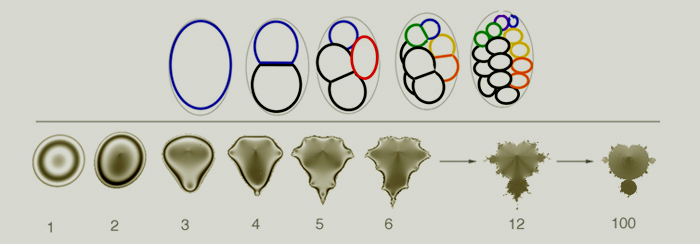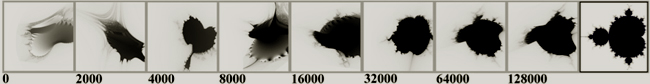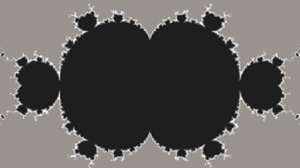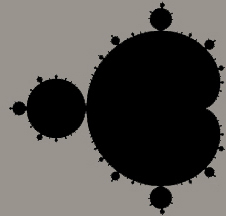 The Mandelbrot equation is z = z2 + c, where z and c are complex numbers and c is a location in the complex plane being tested. The function is applied many times, with the output value of z from each iteration being used as input for the next iteration. During iteration, if the value of z exceeds a magnitude of 2, then iteration halts and we declare that location in c as outside of the Mandelbrot Set (white). Otherwise, c lies inside of the Set (black). If the function were iterated only once at each c, the result would be a round shape, analogous to a single cell before subdividing into a multicelullar organism. Each time the function is iterated, the approximation of the Set becomes more refined, and the boundary reveals more bays and peninsulas. Fractal self-similarity increases. ![]() |