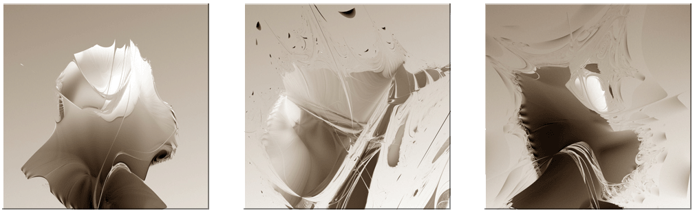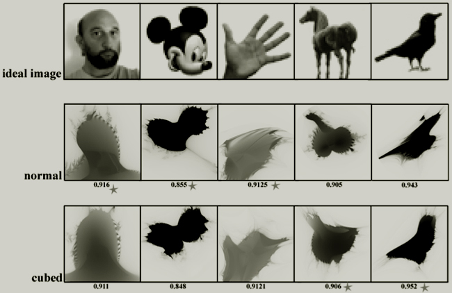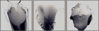 In March '09, the three tweaks below, will be exhibited at the Pence Art Gallery in Davis, California, as a photographic trilogy called, "Fractal Self Portrait". ![]() Here is the accompanying statement to this work: Math is an unlikely medium for self-portraiture. But I have a special relationship with the Mandelbrot Set - regarded as the most complex object in mathematics. It is a magic piece of clay - pregnant with infinite form. I have tried to coerce it into imitating images of my face, using a genetic algorithm technique that I developed. The fractal details are re-adapted into face-like features. From a distance, one sees references to human heads. But there are obvious signs of a genetic signature that is not human. This is a methodology of genetic mimesis - inspired by evolutionary biology. |