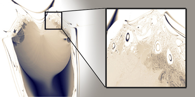 The images below are high magnifications of the boundary of this thing that we thought was just a squashed bug. They are colorized to make it easier to see the many levels of fractal self-similarity. Because of this endless variety of form, this thing - the Mandelbrot Set - has been called the most complex object in mathematics. So, depending on how you look at this thing, it can be quite beautiful. In fact, I might even say it's a little bit too beautiful. All this Psychedelic Baroque - it makes me want to do something subversive. |