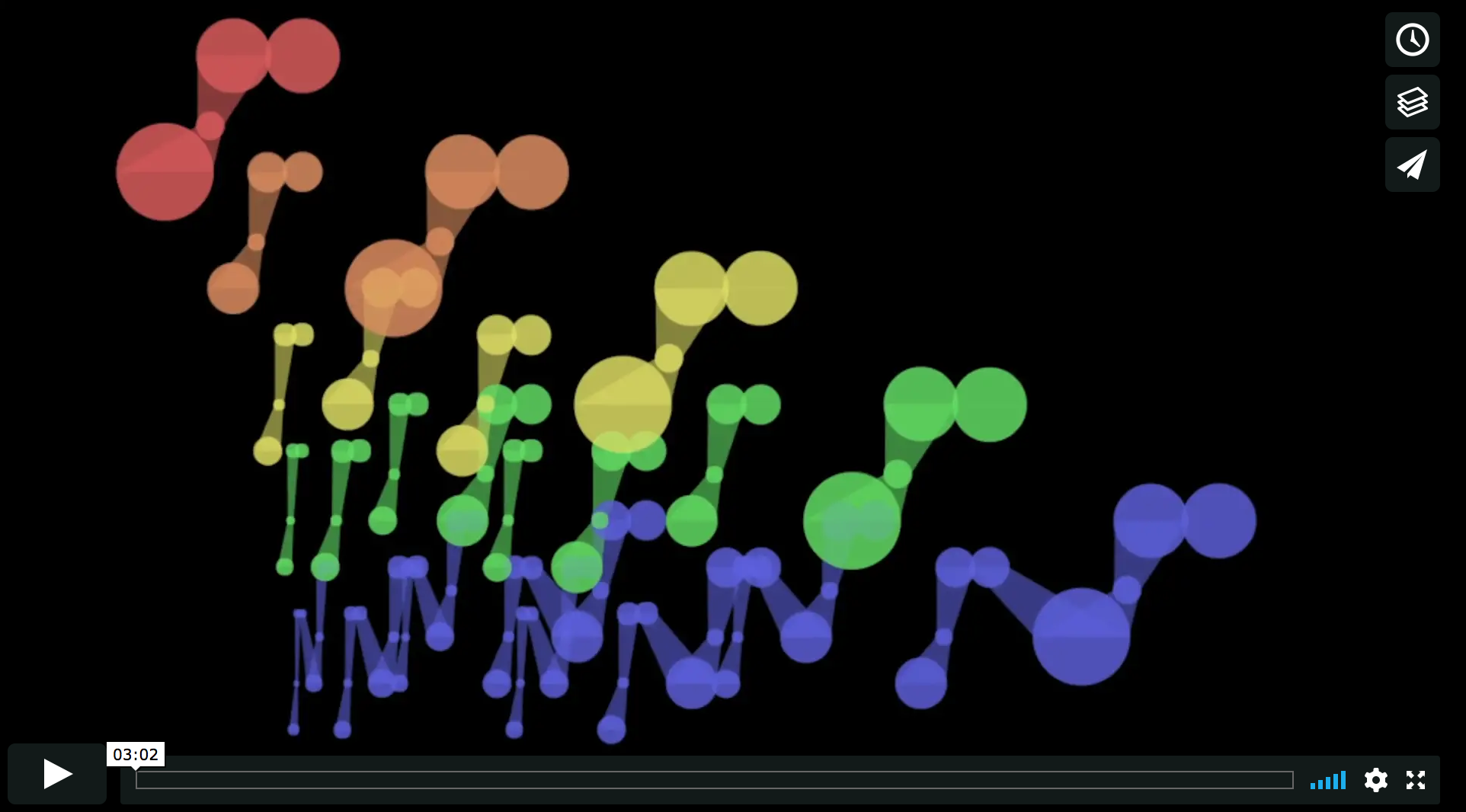 self-similar counterpoint (Please run this in the Chrome browser for best audio) Music is self-similar by nature. Melodies, rhythms, and sonic impressions recur in time, with theme and variation. Identical melodies that start at different times and pitches weave among each other to create intricate counterpoint: fugues. Fractal Fugues are sonic structures that have self-similarity in both the time and pitch dimensions. A motif gives birth to copies of itself that are offset in time and pitch. These copies give birth to more copies that are offset in time and pitch, in proportion. There can be up to six levels (generations of birth), resulting in notes multiplying at a high exponential rate. John Cage looked at branching trees and swimming fish and he saw notes on a staff. To “hear” a tree is to discern trunk from branch, and to experience a thousand leaves as a texture of sound. This animation was written in JavaScript, and uses web audio oscillators. Created by Jeffrey Ventrella ventrella.com |