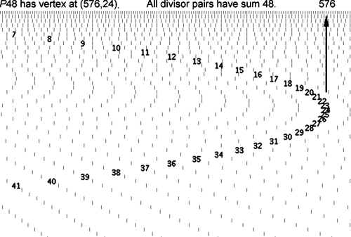 I tested to see if any other divisor pairs besides those on the parabola have the same sum, and it appears that there are none. And so, my hypothesis is that a square root parabola contains the only divisor pairs with this constant sum. Therefore, a square root parabola Pn can be defined more simply as: "the set of conjugate divisors in the divisor plot whose sum is n". One test I did is illustrated below, with parabola P48, whose vertex is located at (576, 24). The illustration highlights numerals for the divisor pairs whose sums equal 96 (which is 48 x 2). The image is greatly stretched vertically to make it easier to see.