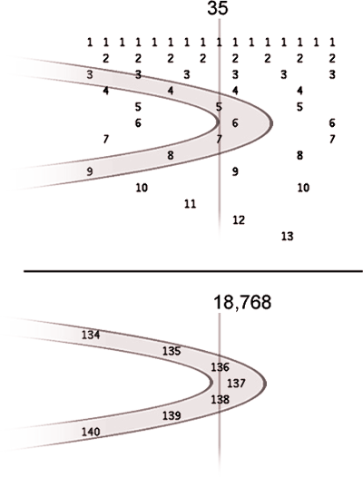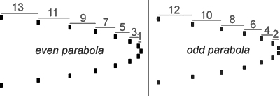Look again at the even-numbered parabola I just showed you. The x-spacing between divisor pairs corresponds to the series of odd numbers, counting from right to left.