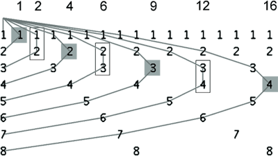 (an algebraic curve that uses only integers). It defines a set of lattice points that correspond to sets of divisors, numbered 1 to n, as shown below. It appears as if the entire set P fully tessellates the divisor plot: it intersects every divisor. Every divisor pair is a member of one and only one square root parabola. This is illustrated in the image below showing P1 through P8, indicated with straight lines connecting the ordinal series of divisors that lie on them.