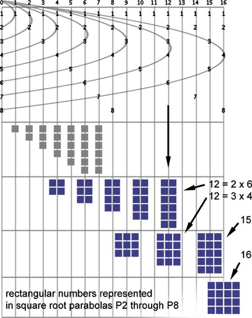 For example, the rectangular number 12 is shown as occurring on P7 and P8. The associated symbols show two of the three ways to express 12 (2x6 and 3x4). (The third way, 1x12, occurs on P13, which is not included in this illustration). This illustration may help give insight as to why these parabolas exist. The answer may have to do with the possible ways to arrange these blocks into rectangular arrays. Note that primes can only be represented in single-column, and that their divisors are always the second pair occurring at the left edge of a parabola (after the pair occurring at x=0).