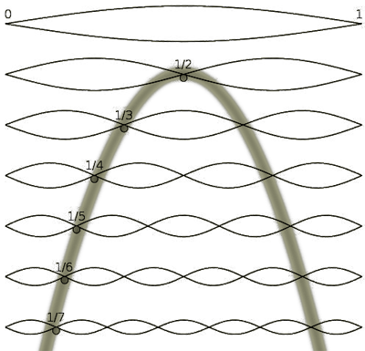 Parabolas appear often in the physical world, and also in mathematical visualizations, such as what we have just seen in the previous chapter. Parabolas appear when you plot a graph of the subdivision of sine waves into integer-number frequencies, like the harmonics in a guitar string, vibrating in halves, thirds, quarters, fifths, and so-on.