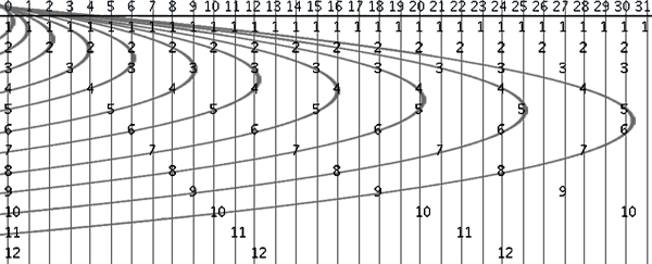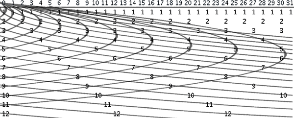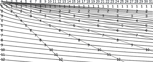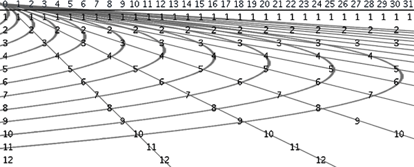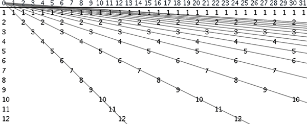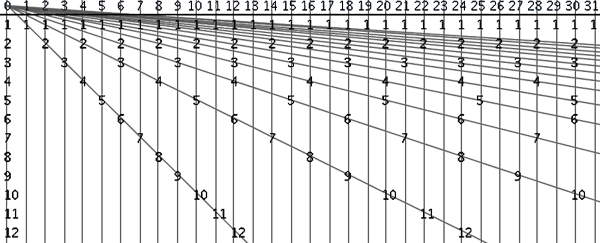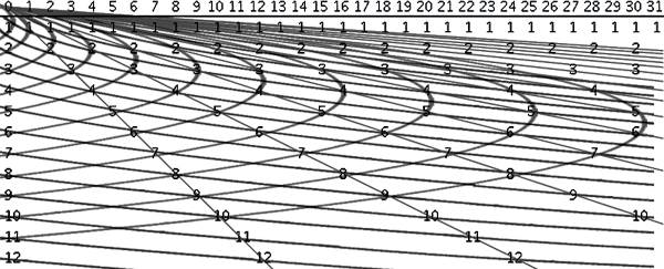 When considered as a member of a row Ry, a divisor is simply one of an infinite set of integers, which all have the same value - equal to its y coordinate. We have considered divisors along a row as representing a periodic signal over time, such as a blinking light or a beat in a musical polyrhythm. Differences in periods among rows are based on integers, and every possible integer period occurs in the set R. Seeing divisors as members of rows is one way to visualize the the Sieve or Eratosthenes.