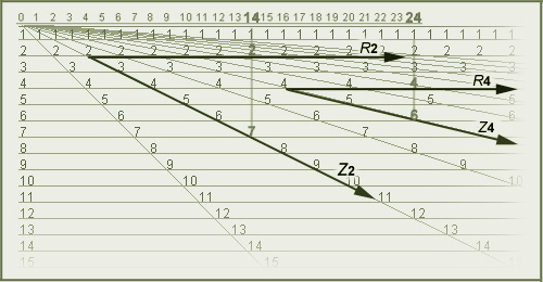 Observe that for any n, Zn and Rn are associated. The illustration below shows that they each provide one of the divisors of a conjugate pair, whose product equals their x coordinate value. Two examples are illustrated: x = 14, and x = 24.