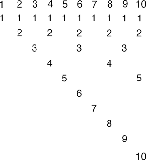 and themselves. Now, write the integer divisors of these ten numbers in columns underneath,