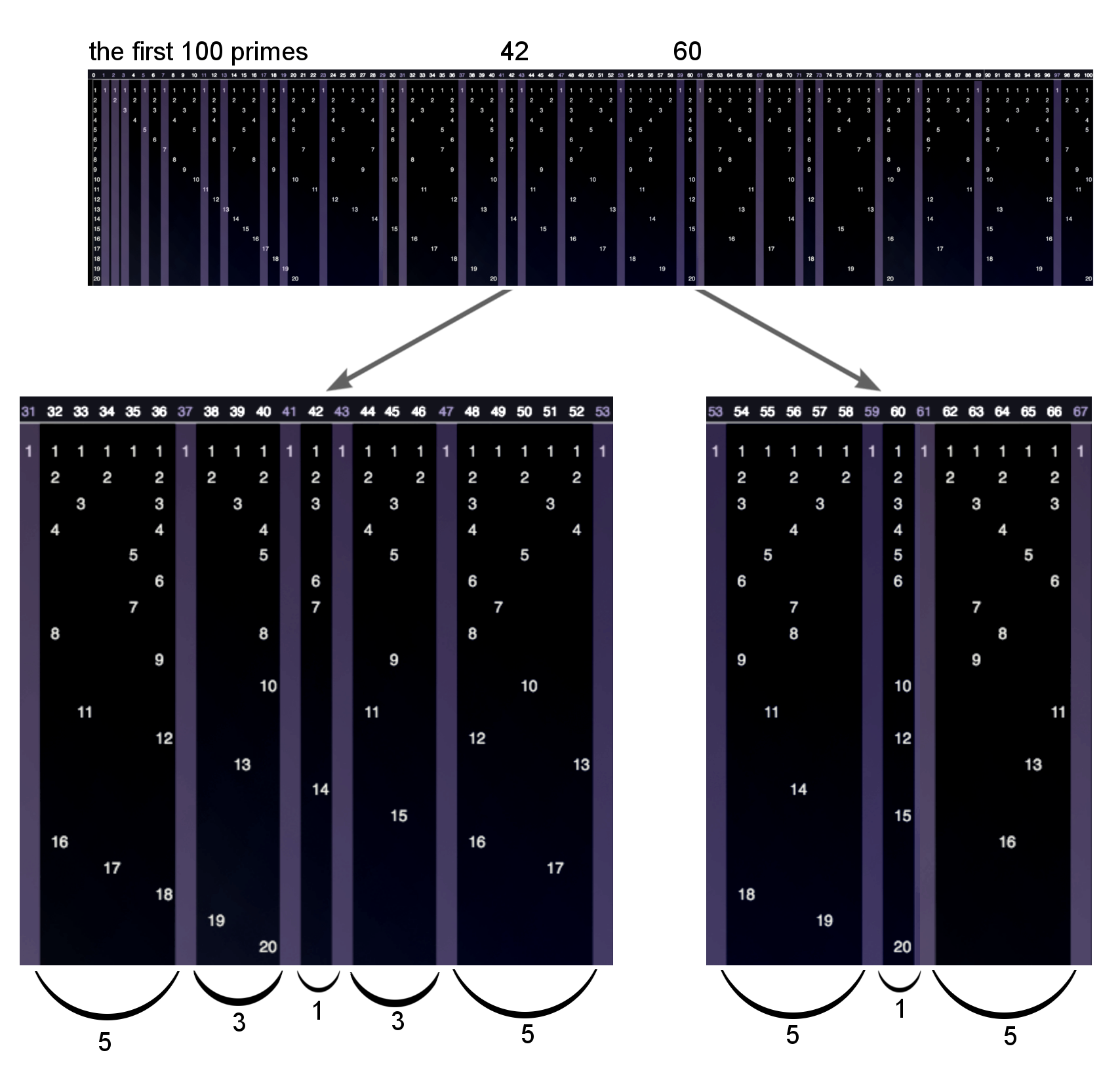 I selected the composite numbers 42 and 60 as examples of how their immediate prime neighbors exhibit left-right symmetry. Actually, I have been told by a mathematician friend of mine that this symmetry is not just in the immediate neighborhood, but that it extends well beyond. And the reason that this symmetry appears to break down after a certain distance is because of the overlapping effect of many composite number patterns - each one having its own symmetrical pattern. Later on in the book we will explore more forms of symmetry about certain composite numbers.