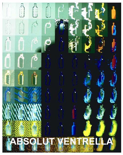 The images below are examples of Absolut Vodka-shaped Bottle forms meta-designed by Jeffrey Ventrella. They were bred by many anonymous people who visited the EVOL-ART site, which was part of the ABSOLUT KELLY site, featuring Kevin Kelly's book, "Out of Control." A genetic algorithm was used to generate these images. Unfortunately, this site is now defunct :( This work is mentioned in Mitchell Whitelaw's book: "Metacreation: Art and Artificial Life" |