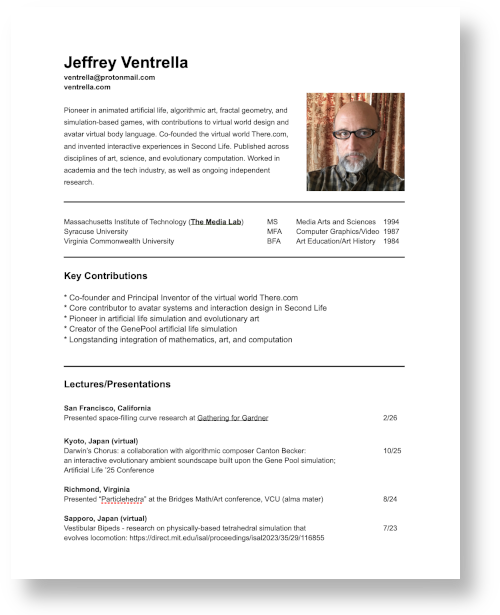 Lectures/Presentations Santa Fe, NM Currents - New Media Festival: Darwin’s Chorus: on-site sound/visual installation, collaboration with algorithmic composer Canton Becker: an interactive evolutionary ambient soundscape built upon the Gene Pool simulation; 6/26 San Francisco, California Presented space-filling curve research at Gathering for Gardner, 2/26 Kyoto, Japan (virtual) Darwin’s Chorus: a collaboration with algorithmic composer Canton Becker: 10/25 Artificial Life ’25 Conference Richmond, Virginia Presented “Particlehedra” at the Bridges Math/Art conference, VCU (alma mater) 8/24 Sapporo, Japan (virtual) Vestibular Bipeds - research on physically-based tetrahedral simulation that 7/23 evolves locomotion: https://direct.mit.edu/isal/proceedings/isal2023/35/29/116855 Helsinki, Finland (virtual) Presented “Composite Number Polyrhythms: Animating and Sonifying the Divisor Plot” 8/22 Bridges Math/Art Conference Mendocino Redwoods, California Presented “The Future of Decentralized Art and Music “ at DWEB Camp 8/22 Linz, Austria Presented paper on fractal curve techniques at the Bridges Math/Art conference 6/19 Palo Alto, California Presented original research at Stanford University as part of the MediaX series 4/17 https://mediax.stanford.edu/events/artificial-life-meets-augmented-reality San Jose, California Presented my work on AI-driven characters for augmented reality 11/16 at the Narrative Summit Santa Barbara, California Presented keynote at the Immersive Learning conference 6/16 Los Angeles, California Presented on a panel at Digital Hollywood 10/15 Barcelona, Spain Presented keynote presentation at VISIGRAPP conference 2/13 Pittsburgh, PA Presented Virtual Body Language at Carnegie-Mellon University’s ETC 10/11 Vancouver, BC, Canada Gave keynote presentation at International Symposium on Computational Aesthetics in Graphics, Visualization, and Imaging: a SIGGRAPH co-located conference. 8/11 Menlo Park, California Gave a presentation at the Talks on Computing Systems series at Carnegie-Mellon University, Silicon Valley, NASA Ames Campus 5/11 Laval, France Gave the first keynote at the Laval Virtual conference 4/11 Los Angeles, California Virtual Body Language: Presented avatar expression at an invitation-only workshop at ICT, USC 2/11 Banff, Alberta, Canada Self-Portraits in Mandelbrot Genetics: Smart Graphics. Presented mathematically-generated artworks 6/10 Toronto, Ontario, Canada The Gestural Turing Test: AAMAS Presented motion-capture experiment in nonverbal communication and believability 5/10 (details available at http://gesturalturingtest.com/ ) Melbourne, Australia Workshop Lecturer: ACAL - Presented ecological simulation using planetary toy physics, emphasizing Open, collaborative development 12/09 Palm Springs, California Keynote Speaker. HPC Horizons. : How genetics, physics, and communication can be represented for efficient traversal over the internet for virtual worlds. Other Keynote speakers were Craig Venter and Jaron Lanier. 3/08 Boston, Massachusetts Prime Numbers are the Holes Behind Complex Composite Patterns (The Divisor Plot ) at the 7th International Conference on Complex Systems 10/07 Vancouver, BC, Canada Online Body Language - Expressivity and Identity in Avatars and Autonomous Creatures 9/07 School of Interactive Art and Technology (SFU) Research Colloquium Boston, Massachusetts Physical Avatar – a new technology for Second Life 8/06 SIGGRAPH conference Tech Talk Bloomington, Indiana A Particle Swarm Selects for Evolution of Gliders in Non-uniform 2D Cellular Automata - paper presented at Alife X conference 6/06 Pittsburg, Kansas presented overview of work at Pittsburg State University 4/05 Bilbao, Spain conducted workshop at the Universidad del Pais Vasco on techniques for using mathematics to generate portraits. Presented interactive and print work at La 17 Exposición de Audiovisuale. 12/04 Bilbao, Spain Sharing the Virtual Ecosystem (the Interactive Web of Virtual Life and Avatars) Art and Technology Symposium, Universidad del Pais Vasco 12/03 Stanford University, Palo Alto, CA Avatar-Centric Communication in There, co-lectured with Dr. Chuck Clanton, at the Human-Computer Interaction Seminar 4/03 Dundee, Scotland Artful Biology: Simulated Creatures for Software Entertainment, presented at International Centre for Computer Games and Virtual Entertainment 2/01 Paris, France Avatar Physics and Genetics, presented at Virtual Worlds, 2000 7/00 San Jose, CA presented artificial life research at Digital Biota conference 11/99 Syracuse, NY Presented overview of artistic development Syracuse University Visual and Performing Arts Dept. 2/99 Paris, France Designing Emergence in Animated Artificial Life Worlds presented at Virtual Worlds 98 7/98 Los Angeles, CA Attractiveness vs. Efficiency (How Mate Preference Affects Locomotion in the Evolution of Artificial Swimming Organisms) - presented at Artificial Life VI 6/98 Brighton, England Darwin Pond - Demonstration presented at the European Conference on Artificial Life 7/97 Montreal, Canada Eukaryotic Virtual Reality (The Emergent Art of Artificial Life) - presented in a Panel at ISEA95 conference 9/95 Geneva, Switzerland Disney Meets Darwin - Paper presented at Computer Animation, '95 4/95 Cambridge, MA Explorations in the Emergence of Morphology and Locomotion Behavior in Animated Characters - Paper presented at Artificial Life IV, MIT 7/94 San Diego, CA Artificial Life and a Computer Art of Emergence - slide and video lecture: Center for Research and Computing in the Arts, UCSD 5/92 New London, CT A Genetic Approach to Computer Art - Visiting Artist, lectured and conducted workshops on mathematical images, Center for Arts and Technology, Connecticut College 10/91 San Francisco, CA Factors Inducing Periodic Breathing in Humans (a case study in scientific data visualization), co-lectured with Dr. Wayne Fordyce, at Visualization '90 10/90 Halifax, Nova Scotia, Canada Computer Graphics f